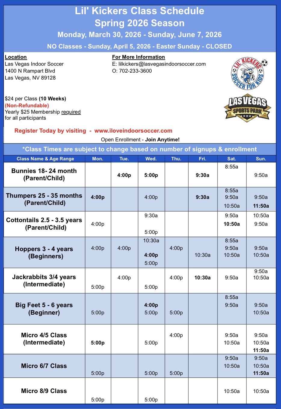 Find the perfect Class for your child and then call us for a FREE Trial Class. Whether your child is new to soccer or has already developed a love for the game, the progressive nature of Lil’ Kickers offers a place for children at every level. Our convenient class times provide families options to accommodate multiple children and busy schedules. Our balanced and creative approach to coaching will have a positive impact on your child that goes far beyond the soccer field. Our high-energy classes are carefully designed to enhance your child’s overall growth and well-being.